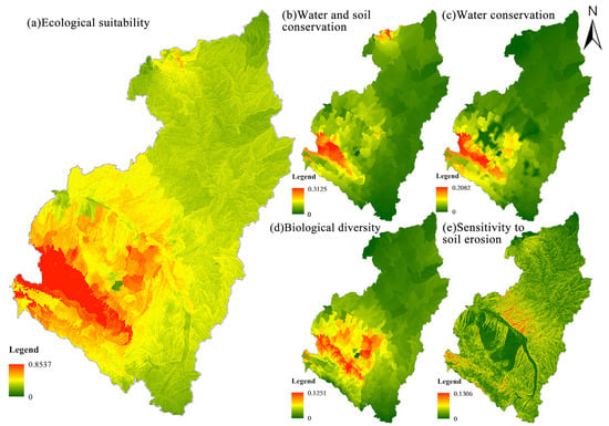The ecological protection suitability (EPS) includes two aspects: the evaluation of the importance of ecological system service function and ecological sensitivity [40]. The evaluation was performed by selecting 4 secondary indicators, namely the importance of water and soil conservation function, the importance of water source conservation function, the importance of biodiversity maintenance function, and the sensitivity of soil and water loss, and the calculation formula is as follows: