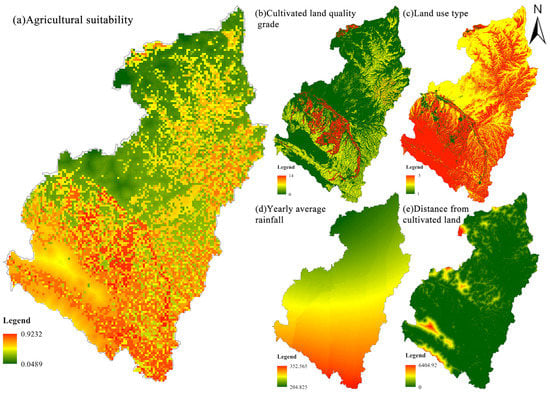 The high-value areas of the agriculture production suitability are mainly distributed in most areas of the southern and central regions, and the low-value areas are mainly distributed in Jinya, Haxian, Qingcheng, and Yuanzicha (Figure 7a). The results of the agricultural production suitability showed that the quality grade of cultivated land is higher in the central region but is worse in the mountainous and hilly regions in the north and south. The high-value areas are mainly distributed in Qingcheng, Lianta, Chengguan, Qingshuiyi, Jinya, Xiaguanying, Dingyuan, Heping, and Xiaokangying, while the low-value areas are mainly distributed in the southern mountainous areas and the hilly and gully regions in the central region (Figure 7b). Regarding the land use type, the high-value areas are dominant in general, and the low-value areas only appear in the central region. The central region is flat, which is the main urban construction area and an important agricultural production area. The high-value areas are mainly distributed in Chengguan, Xiaokangying, Xiaguanying, and other towns, while the low-value areas are distributed in the towns Chengguan, Xiaokangying, Xiaguanying, etc. (Figure 7c). The average annual precipitation decreases from southeast to northwest successively, with more precipitation in the southern forest region and less precipitation in the northern loess hilly region (Figure 7d). Regarding the distance from cultivated land, the low-value areas are dominant and are widely distributed; the high-value areas appear only in a few regions and are mainly distributed in the north and south of Xinglong Mountain, the southwest of Qingcheng Mountain, the middle of Jinya, and the north of Heping (Figure 7e).