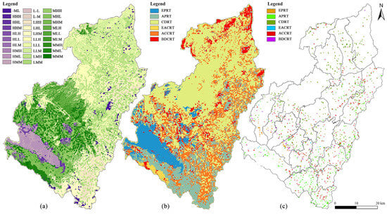 The spatial analysis of the idle residential renovation types: (a) the spatial coupling analysis of suitability; (b) the spatial analysis of renovation types; (c) the spatial distribution diagram of the idle residential renovation types.
