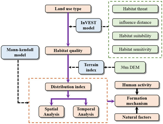 where is the weight of the different threat factors, is the intensity of the threat factor, is the anti-interference level of the habitat, is the relative degree of sensitivity of the different habitats to different threat factors, is the habitat threat factor, is the grid in the threat factor , is the distance between grid , grid and is the influencing scope of the threat factor . The habitat quality index was calculated as follows [18,36,37]: