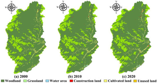 Land-use change from 2000 to 2020: (a) 2000, (b) 2010, (c) 2020.