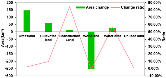 Changes in the type of land use were obtained based on the land-use maps of 2000, 2010, and 2020 (Figure 3). The main land-use types in the upper reaches of the Minjiang River were woodland and grassland, representing more than 95% of the total area. The rest were cultivated land, water areas, unused land, and constructed land of various sizes. From 2000 to 2020, the upper reaches of the Minjiang River exhibited an increase in constructed land, water areas, and unused land, a fluctuation in cultivated land, and a decrease in woodland. From 2000 to 2010, woodland experienced the greatest decrease, with a reduction of 252.9 km2, representing a loss of −1.02%. The constructed land exhibited the greatest increase (13.9 km2), representing a gain of 84.54%. From 2000 to 2010, all the areas except for woodland, experienced an increase, with cultivated land, grassland, water areas, constructed land, and unused land showing gains of 9.60%, 2.40%, 57.03%, 84.54%, and 0.18%, respectively, (Figure 4). From 2010 to 2020, the cultivated land and woodland area decreased, with losses of −4.76% and −0.16%. The area of grassland, water areas, constructed land, and unused land increased, exhibiting gains of 2.40%, 57.03%, 84.54%, and 0.18%, respectively, (Figure 5).
