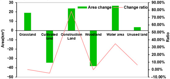In Equation (1), represents the change ratio of a certain type of land use and and are the area corresponding to the land use at the beginning and end of the study (km), respectively.