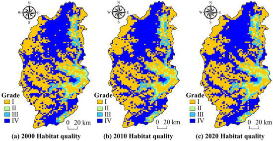 From the perspective of temporal and spatial changes, the area of watershed Level IV decreased by 2% from 2000 to 2010, mainly changing from Level IV to Level III. The areas of habitat quality of Level II and Level I increased by 12.15% and 19.52%, respectively. From 2010 to 2020, the ecological quality area of Level IV decreased by 0.02%, Level III increased by 0.79%, and Level II decreased by 3.8%. The ecological quality area of Level I increased by 31.8%. Level II, Level III, and Level IV exhibited increases of 50.76%, 29.27%, and 20.92%, respectively. Overall, the habitat quality decreased from 2000 to 2020, which was reflected in the decrease in the area of Level IV habitat quality and the increase in the area of Level I habitat quality. By comparing the three years, we observed that the habitat quality of Level IV significantly decreased but the area of habitat quality of Level I continues to increase (Figure 7), and the environmental pressures are still considerable.