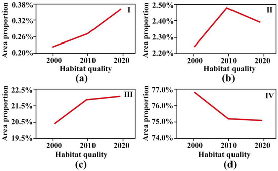 Changes in the different levels of habitat quality: (a) Level I (b) Level II (c) Level III (d) Level IV.