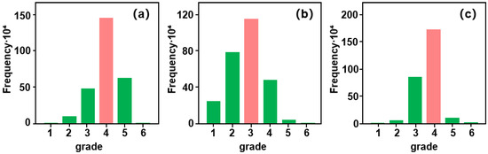 Using the equal interval classification method ArcGIS, the altitude, slope, and topographic potential index of the upper reaches of the Minjiang River were reclassified. The interval values were 1000, 12, and 0.34, respectively, which were divided into six grades from small to large. The altitude was concentrated in Grade 3 (2000–3000 m), Grade 4 (3000–4000 m), and Grade 5 (4000–5000 m), accounting for 95.9% of the total area. The slope was concentrated in Grade 2 (12°–24°), Grade 3 (24°–36°), and Grade 4 (36°–48°), accounting for 89.1% of the total area. The topographic potential index was mainly concentrated in Grade 3 (1–1.34) and Grade 4 (1.34–1.68), accounting for 94.1% of the total area (Figure 8). Some differences were observed between the topographic potential index and the changes in the height and slope of the area. This suggests that the distribution of the topographic potential index is affected by topographic combinations with high elevation/small slope and low elevation/large slope.