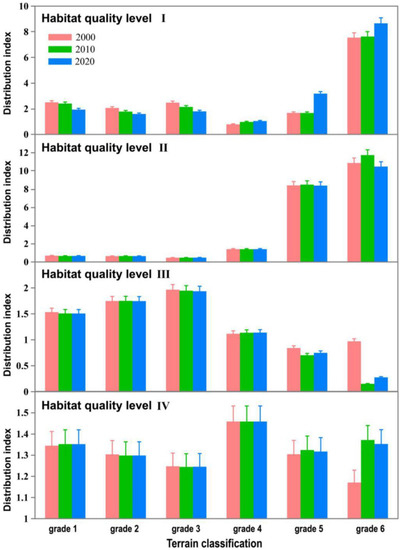 The topographic distribution indexes of the different habitat qualities in 2000, 2010, and 2020 were statistically analyzed to reveal the topographic gradient effects of the temporal and spatial distribution of the habitat. As shown in Figure 9, the distribution index of the habitat quality of Grade 6 was significantly higher than those in Grades 1–5. Moreover, the distribution index in 2020 became lower for the terrain in Grades 1–4 and higher for the terrain of Grade 6 compared with 2010 and 2000. The distribution index of medium-quality habitat on the terrain of Grades 5 and 6 was significantly higher than that of Grades 1–4. In contrast with the concentrated distribution of medium- and low-quality habitat in the highlands, the higher-quality habitat was mostly distributed in the middle and low terrain of Grades 1–3 (Figure 10). The distribution in the highlands of Grades 4–6 in 2010 and 2020 was significantly lower than in 2000. The topographic gradient effects of high-quality habitat presented a symmetrical distribution pattern of high in the middle and low on both sides. The distribution index was higher for Grade 4 terrain and lower for Grades 1–3 and 5–6.