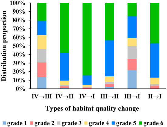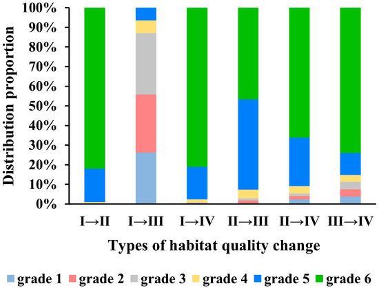 To analyze the consistency of the changing trend of habitat quality we calculated the trend proportion of the annual average habitat-quality value from 2000 to 2020. At p < 0.05 (z = 1.67), the proportions of the three types of trends (significant decline, no significant change, and significant increase) were 22.2%, 41.8%, and 36%, respectively. As shown in Figure 11 and Figure 12, we determined the distribution proportions of the changes in habitat quality for different topographies. As a result, the grids with significant increases and decreases were mainly distributed in the highlands (Grades 5 and 6). For example, habitat quality Levels IV and III changed into habitat quality Level I. The grids with significant increases were mainly distributed in the lowlands (Grades 1–3). For example, habitat quality Level I changed into habitat quality Level III. The grids that did not change significantly were mainly distributed in the middle terrain (Grade 4). Therefore, the results show that the highlands were the predominant area of the grid with a significant decrease in habitat quality, whereas the lowlands were the predominant area of the grid with a significant increase in habitat quality. The middle topographic position was the predominant area of the grid with no significant changes in habitat quality (Figure 13). This result is consistent with that reported by Wang and Cheng (2022) for the geomorphic differentiation of habitat quality.