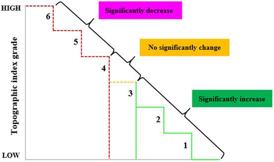 In Equation (6), is the topographic position, and are the elevation of a point and the average elevation of the area where the point is located, respectively, and and are the slope of a point and the average slope of the area, respectively. The higher the elevation and the greater the slope, the greater the topographic potential index and vice-versa.
