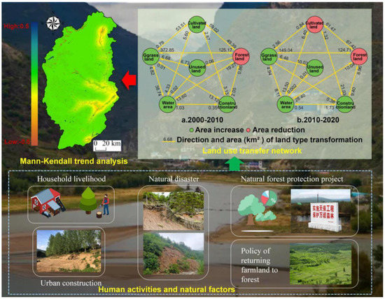 From 2000 to 2020, the proportion of ecological restoration with a significant increase in habitat quality for terrain Grade 4 reached 80.7%. According to the spatial distribution of land use in the area of the study, the middle terrain was not only the predominant area covered by woodland, shrub woodland, and grassland, but also the main implementation area of desertification control, returning farmland to woodland and grassland, and preventing the access to mountains for wood harvesting [12]. The implementation of these projects can rapidly improve habitat quality. The comparison of the periods of 2000–2010 and 2010–2020 revealed that the woodland area decreased gradually. Although the land type still changed from woodland to grassland in the last decade, the scale of this change was significantly reduced when compared with 2000–2010. This result shows that the consolidation of projects to protect natural woodland resources, the conversion of farmland to woodland, and woodland protection projects implemented in the upper reaches of the Minjiang River during the 12th and 13th Five-Year Plans were effective for the protection and restoration of woodlands. The results of the Mann–Kendall test revealed that the distribution of the grids with a significantly increased and a significantly decreased habitat quality for the middle terrain was the same.