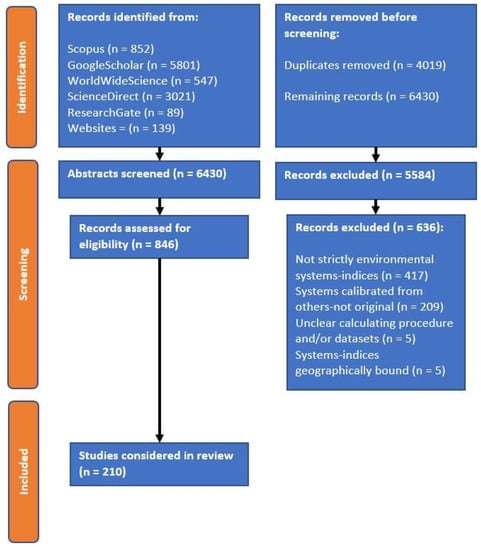 Overall, a total of 210 studies met the inclusion criteria and were considered in the review. Τhe selection process in numbers is presented in Figure 1. From the selected studies, a total of 63 systems indices were gathered—including modified versions—across 16 countries, as presented in Table 1.
