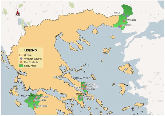 - Gouma, B. Methodology of Spatiotemporal Estimation of Meteorological Danger of Forest Fir—Application in the Mountainous Area of Parnitha. Ph.D. Thesis, Agricultural University of Athens, Athens, Greece, 2001. Available online: https://www.didaktorika.gr/eadd/handle/10442/12994 (accessed on 29 December 2022).