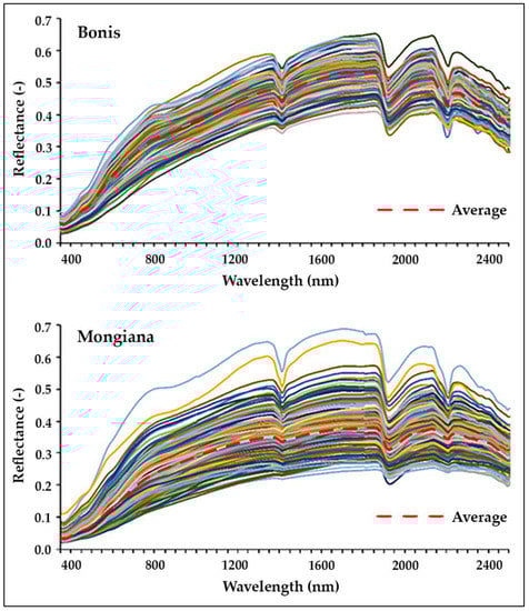 To reduce the noise level, the average of 50 spectra for each soil sample was calculated. Finally, the diffuse reflectance spectra were resampled every 10 nm wavelength to reduce the total number of raw reflectance bands and avoid overfitting [14].