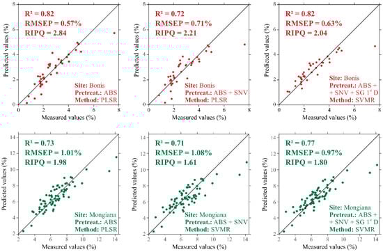 In order to summarize the results obtained, Figure 3 shows the scatter plots of the best performance of the SOC prediction models in the two study areas obtained by PLSR and SVMR coupled with each of the three combinations of diffuse reflectance spectra pretreatments.