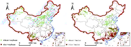 In terms of space, considering that a region may not only be suitable for the transformation from grain to soybeans, but also suitable for the transformation from grain to corn, a new judgment standard was added to avoid repeated calculations. Taking soybeans and wheat adjustment as examples, if a region was both Type III of soybeans and Type IV of wheat, and PYAIsoybean > PYAImaize, it is better to adjust wheat to soybeans. Judgment criteria on whether adjustments from rice to soybeans, from wheat to maize or from rice to maize were better could be similarly inferred. The results (Figure 4) showed that grids appropriate for adjustment from wheat to soybeans were concentrated in northern Xinjiang, the Hexi Corridor, the Fen–Wei Plain, the Shanxi–Hebei–Inner Mongolia intersection area and the Jiaodong Peninsula. A few grids were appropriate for adjustment from rice to soybeans and were mainly concentrated in Yunnan and Fujian provinces. Grids appropriate for adjustment from wheat to maize were mainly concentrated in northern Xinjiang, the Huang–Huai–Hai Plain as well as the Middle-Lower Yangtze Plain. Grids appropriate for adjustment from rice to maize were concentrated in Fujian and southern Jiangxi, with scattered distributions in Guangdong and Guangxi provinces.