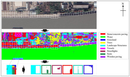 We created nine new ROI and selected multiple geometric sample ranges (geometry) for each land type ROI as training samples for supervised learning. This resulted in the identification of nine distinct planar elements, including hard surfaces, water bodies, grasslands, woodlands, constructions, vessels, streetlights, seating, and wooden pavements, alongside the generation of RGB color cluster analysis images. The resulting images were further analyzed using color clustering technology through the use of the proprietary IMAGE COLOR SUMMARIZER web online, which facilitated the derivation of space planar element proportion data and distribution data (Figure 5). Moreover, based on the results of spatial element identification, we summarized the distribution pattern characteristics of the elements, such as distribution in the form of points, lines, and surfaces (hereafter referred to as point-like distribution, ribbon distribution, and faceted distribution), as a variable for exploring the interaction between the elements and crowd preferences.