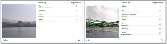 Semantic segmentation is effectively able to provide pixel-level category information. In this paper, we applied Semantic Segmentation to recognize spatial elements []. The methodology used in Tencent’s Semantic Segmentation technology achieved state-of-the-art performance on challenging benchmarks, significantly outperforming previous methods with Mean Intersection over Union (MioU) up to 55.1% []. Tencent Image Recognition Free Online Trial Platform 2015 was employed to facilitate batch recognition of a vast collection of space images, resulting in the identification of distinctive element tags and their corresponding image proportions (Figure 4). The judicious utilization of this technology underscores the study’s innovative approach and the researcher’s commitment to employing the most advanced and sophisticated tools available in their research endeavors.