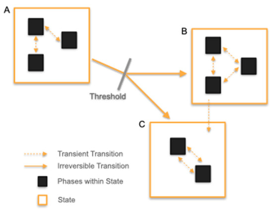A simplified conceptual state-and-transition model. The large boxes represent states. (A) is the original state and (B,C) are alternative states. The smaller solid boxes represent phases within a state, and the arrows indicate directional transitions between states with known or hypothesized drivers. The line bisecting the arrows between the larger boxes represents a threshold that once crossed, often requires active restoration approaches to return the system to the desired state. Inspired by [1].