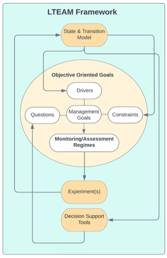 A conceptual representation of the Long-Term Ecological Adaptive Monitoring (L-TEAM) framework that depicts how inputs (dark orange ovals) can be used to inform objective-oriented goals (OOGs). The conceptual model is a state-and-transition model, which lends itself well to the representation of complex landscapes. Management and restoration goals are coupled with questions to create objective-oriented goals (OOGs). OOGs articulate the drivers and constraints identified in the STM that directly affect the management goal of concern; they help turn those management goals into questions, and finally they assist in identifying what we need to monitor to answer our questions. This informs the design of rigorous experiments, the results of which can be incorporated back into the STM and then used to inform the development of decision support tools.