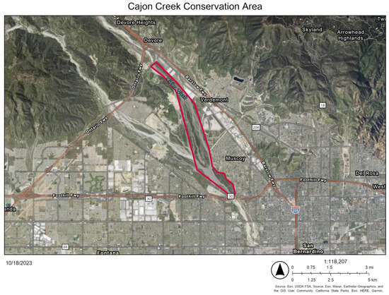 The Cajon Creek Conservation Area (designated by the red border) located in Riverside County in Southern California. The area is a semiarid region with a Mediterranean-type climate [25]. The vegetation consists primarily of Riversidian Alluvial Fan Sage Scrub (RAFSS), which is a rare Southern Californian alluvial floodplain ecosystem.