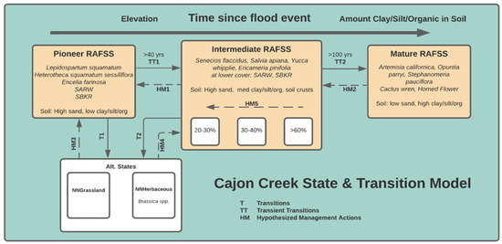 The STM for the Cajon Creek Conservation Area highlights the main drivers of floodplain ecosystem dynamics: flood events and time since the last flood event (Figure 4). Floods scour existing vegetation and soil, transitioning parts of the landscape back to an earlier phase [36,37], resulting in a mosaic of habitats. Elevation and soil are also key factors; typically, higher elevations have more developed soils and vegetation phases. Within the successionally intermediate RAFSS phase, we also identified three shrub cover levels related to conservation management goals (lower cover has higher habitat quality for SBKR). We also identified two (undesirable) alternative vegetation states: nonnative annual grasslands cover, consisting primarily of Avena and Bromus spp.; and nonnative herbaceous cover, consisting primarily of Brassica spp. We identified state transitions and their drivers, and transient transitions between states and phases, as well as the hypothesized management actions (e.g., conservation grazing, manual removal) necessary to reverse, initiate, or prevent undesirable transitions (Table 2).