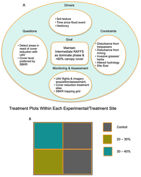 For CCCA, an overarching goal is the restoration of habitat for species of conservation concern. Studies have shown that both SBKR and Woolly Star prefer a more open shrub habitat, with some studies suggesting over 60% shrub cover is too dense, and cover of 30% or less as ideal [38]. However, there is some concern that reducing cover too much may invite invasion by nonnative plant species. The drivers related to this habitat conservation goal (Figure 5A) identified in the STM (Figure 4) are time since flood event and soil texture. Some of the constraints to both monitoring and attaining this goal are the size of the site (large sites may be too costly to monitor through ground-based transects), the limited ability to manipulate hydrology and soil texture, and potential invasion by nonnative species. This management constraint initiated the question of whether cover of intermediate RAFFS could be determined by monitoring through imagery obtained by unmanned aerial vehicles. Managers are also interested in determining how much cover should be reduced (to 20–30% or 30–40%) in order to promote occupancy by the species of concern, while not inviting encroachment by nonnatives (Figure 5A). To address these questions and assess progress toward management goals, working with stakeholders, we determined appropriate monitoring protocols that included the initiation of strategic UAV flights with appropriate imagery acquisition and analysis, continued SBKR trapping, and assessments of both the effectiveness of shrub cover reduction activities and the effects of shrub cover reduction on SBKR occupancy and the presence of nonnatives. This led to the development of the experiments discussed below.