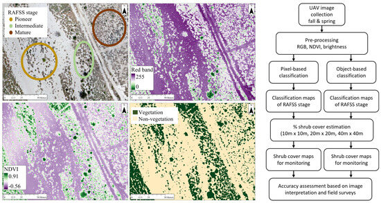 Example of image analysis of Cajon Creek Conservation Area shrub cover monitoring, showing initial imagery from the September 2021 flight. Methods are based on those of Warkentin et al. [40]. Panchromatic imagery showing part of the study area (upper left); red bands (upper right) and NDVI (lower left) for the same area; classification of vegetation/non-vegetation to be used to estimate shrub cover (lower right). The workflow (left panel) describes the various steps from the UAV imagery to shrub cover assessments. Figure developed by M.B. Rose.