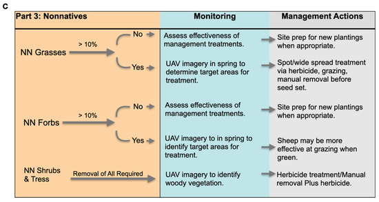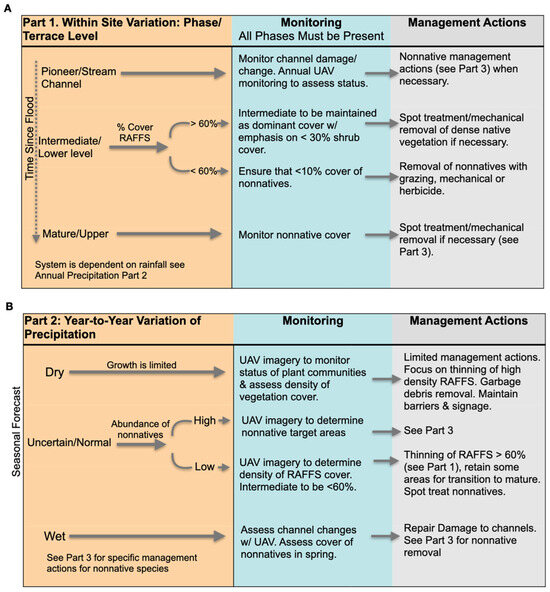 We used the STM (Figure 4) and OOGs (Figure 5) to develop the decision support tool for CCCA (Figure 7). Thresholds were identified that trigger management actions (e.g., nonnative plant cover of greater than 10%). The three parts of this decision support tool (Figure 7A–C) correspond to goals, drivers and constraints defined in the OOG: (A) the RAFFS phase for the habitat under consideration; (B) the annual precipitation (as precipitation and flood events are system drivers); and (C) the functional group of nonnative herbaceous plants present (broadleaf forbs versus graminoids). For example, if the intermediate RAFFS has more than 60% cover, spot treatment or mechanical removal of dense native vegetation is to be initiated. During a wet year, UAV imagery should be used to assess damage to the channel, and spring flushes of nonnative herbaceous vegetation cover and removal of nonnative vegetation should be initiated before seed-setting, via herbicide for grasses and sheep grazing for forbs when still green. As new information is obtained, the decision support tool can be updated, thus allowing for data collected through long-term monitoring to directly influence management actions.