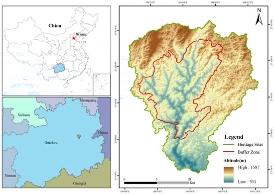 In recent years, scholars have paid attention to the ecological conditions of World Natural Heritage sites from different perspectives. Xiao et al. carried out an evaluation of the impact of the Zhangjiajie Grand Canyon Glass Bridge on the aesthetic value of the Wulingyuan World Natural Heritage site based on the GIS view analysis method [13]. Wang et al. analyzed the perceived willingness of local residents and herders to protect the Kerala World Natural Heritage site based on the perspective of residents’ perception in the community of the heritage site, and determined that community development is a key factor influencing the community’s participation in and support for heritage protection [14]. Zhang et al. introduced a remote sensing eco-index for the in-depth evaluation of the ecological environment quality of a karst World Natural Heritage site and modeled the future development trend, which provides scientific and technological references for the sustainable development of other karst World Natural Heritage sites [15]. Hui et al. constructed a conservation index of heritage value from the perspectives of aesthetics and biodiversity by taking the Xinjiang Tianshan World Natural Heritage site as an example, and provided the heritage management index with a theoretical basis [16]. Sobhani, P. studied the changes in environmental potential and landscape ecology using multi-criteria decision analysis models, fuzzy set theory methods, and mathematical models [17]. In addition, there are quite a number of studies on realizing the ecological environment quality by using remote sensing technology for integrated data collection [18,19,20], three living spaces [21], and landscape patterns [22,23,24,25]. Despite the numerous concerns about World Heritage sites, there have been no studies analyzing the regional ecological environment quality of karst World Natural Heritage sites from the perspective of land type, which in turn is closely related to the development of the regional ecological environment [26].