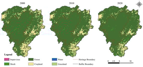 By interpreting the land use of the 2000–2020 images of the Shibing Karst and referring to the classification in Table 1, a three-phase land use classification map was obtained (Figure 2). It can be seen that the heritage site is mainly dominated by forests and shrubs, and other land use types such as grassland exist in a few areas. As for the buffer zone, as the peripheral protection circle of the heritage site, there exist more aboriginal people, and in order to ensure their basic production and life, this land use type is mostly dominated by cropland. In the whole study area, forests and shrubs account for the most area, with both accounting for 85% or more from 2000 to 2020. The area of impervious land and water area is the smallest, with a total share of no more than 10%.