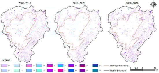 In order to further understand the trend of its land use types, we analyzed the area change mapping of the Shibing Karst over a 20-year period (Figure 3). It was found that the land use types within this heritage site had the least change, and the trend was basically the conversion of shrubs and grassland to forest. In the buffer zone, on the other hand, cropland was the main force of the shift to other types. This was mainly due to China’s policies such as returning farmland to forests in response to environmental degradation such as global warming. Overall, the change was mainly in the buffer zone as the main carrier and heritage sites as the secondary carrier.