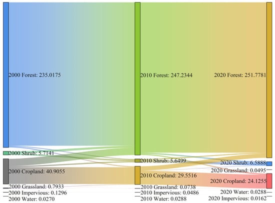 By analyzing the distribution of land use in the three phases, we found that different land types showed different degrees of spatial location conversion and quantitative changes among them during the 20-year period, so we established a land use transfer matrix (Figure 4). On the whole, the area of forest transferred into and out of other land types basically differed little, reflecting its own ecological stability. The area of shrub increased and basically tended toward the ecologically better forest, occupying 12.63% of the total transferred area. Cropland was basically transferred to forest land, which occupied more than 60% of the total transferred area, followed by shrubs, which were basically transferred to ecologically better land types. The transfer of other land types was basically flat, accounting for about 1%. The largest area transferred was of cropland, and the smallest was of forest land.