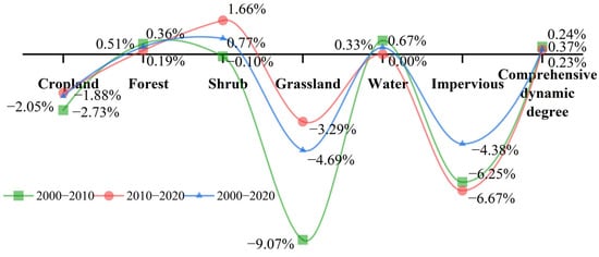 By calculating the dynamic attitude of the integrated land categories, we found that the dynamic attitude of 2000–2010 was the largest, with a value of 0.37%, which shows that the land categories were constantly transforming and were more obvious, and the integrated dynamic attitude of 2010–2020 was the smallest, which shows that the land category transformation basically tended to stabilize. We also calculated the integrated dynamic attitude from 2000 to 2020, and its value was located between the two phases, which shows that the transformation of landforms was first rapid and then stabilized.