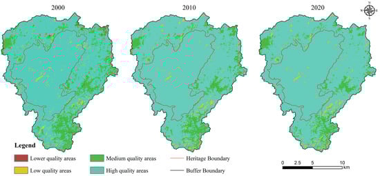 The natural breakpoint method was used to classify the regional ecological quality into four grades and analyze its spatial distribution characteristics more deeply (Figure 6). There is a direct or indirect spatial correspondence between the ecological grades and the different land functional zoning. The high-quality zone is the main part of the study area and basically covers the whole heritage site. The heritage site has a large area of forest and shrubs, is not subject to environmental invasions such as exotic species, and has a more stable development of ecological quality. The low-quality zone is mainly located in the buffer zone on the periphery of the heritage site. The buffer zone allows a small number of aboriginal people to exist, as well as appropriate development and utilization, with strong anthropogenic factors, a concentration of building sites, and ecological protection that is inconsistent with its rhythm, resulting in a poorer ecological quality than that within the heritage site. Overall, the ecological quality of the three phases of the region has not changed much and is basically in a stable state of high-quality ecological development.