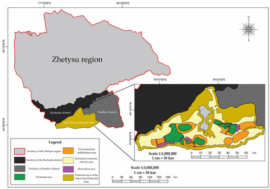 This study was carried out in two districts of the Zhetysu region in Kazakhstan: Panfilov and Kerbulak, where Altyn-Emel National Park (NP) is located (Figure 1). Zhetysu region, with its center in Taldy-Kurgan town, was formed in 2022. Panfilov district, with its center in Zharkent town, was formed in 1928, Kerbulak district (with its center in Saryozek’s urban-type settlement) in 1973 [17].