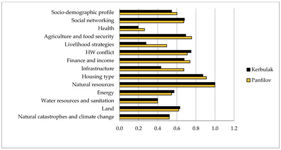 LVI data for 14 components, and 56 subcomponents, for the Kerbulak district (hereinafter KD) and Panfilov district (hereinafter PD) are shown in Figure 2, Table 2, Appendix A.