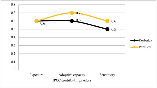 The IPCC-LVI data for the Kerbulak district (hereinafter KD) and the Panfilov district (hereinafter PD) are shown in Table 3, Figure 2. The principal components according to the IPCC methodology are combined into a vulnerability triangle with the definitions of susceptibility, adaptive capacity and sensitivity [41]. The adaptive capacity index for the PD is 0.7, highly vulnerable, and for KD is 0.6, extremely average. The exposure rate in both districts is 0.6, extremely average. The sensitivity index varies and is 0.5 for the KD, and, for the PD, 0.6. The LVI–IPCC data of nomads for the PD is 0.031 and indicates low vulnerability. Data LVI–IPCC of nomads for KD is 0.018 (Table 3, Figure 3).