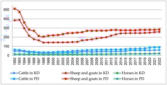 The proportion of households dependent on livestock for food production is high in both districts (Table 2). An analysis of the dynamics of cattle, horses, sheep, and goats in the Kerbulak district from 1992 to 2022 shows that the cattle population increased from 46,600 to 59,500; the horse population increased from 11,600 to 22,400; while the sheep and goat population decreased from 384,100 to 258,200. In the Panfilov district, the cattle population increased from 62,700 to 89,300; the horse population increased from 11,100 to 22,500; while the sheep and goat population decreased from 510,800 to 284,200 (Figure 4) [49,50].