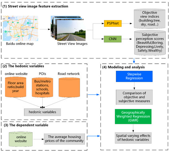 The major steps of the research framework are listed below and presented in Figure 1. First, street view images were collected from the Baidu online map and fed into the deep learning models PSPNet and convolutional neural network (CNN) separately to obtain objective view indices (sky view index, tree view index) and subjective perception scores. Community housing price data and other related variables were gathered from the Anjuke online platform, and community price was set as the dependent variable. The road network and the point-of-interest (POI) datasets were used to calculate hedonic variables. Finally, the subjective perception scores and objective view indices were regarded as two groups of interpretable variables and added with control variables. Using these two groups of variables, we compared and analyzed the results of stepwise regression and GWR.