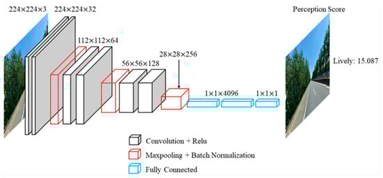 The architecture of Wang’s model is illustrated in Figure 3. Traditional CNN models are typically used for image classification tasks. Wang modified the traditional CNN model and replaced the softmax layer used for classification with a fully connected layer to gather deep-image features and predict human perceptions.