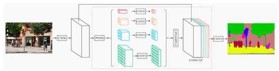 - Zhao, H.; Shi, J.; Qi, X.; Wang, X.; Jia, J. Pyramid Scene Parsing Network. In Proceedings of the 2017 IEEE Conference on Computer Vision and Pattern Recognition (CVPR), Honolulu, HI, USA, 21–26 July 2017; pp. 6230–6239. [Google Scholar]