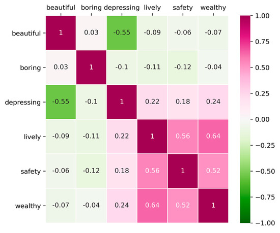 Six different types of perceptions are correlated, as Zhang (2018) showed [19]. The Pearson correlation coefficients for the six indicators are displayed in Figure 6. Some correlation pairs had a strong positive correlation, including “lively–safety” (0.56), “lively–wealthy” (0.64), and “safety–wealthy” (0.52). In contrast, “beautiful–depressing” had a strong negative correlation (−0.55).