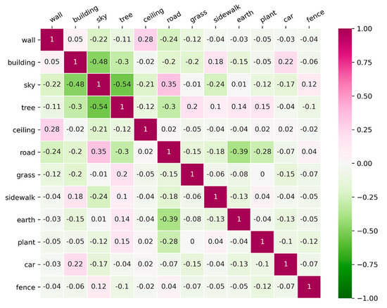 In addition to the perceptual scores, the Pearson correlation coefficients of the top 12 view indices were calculated and are shown in Figure 7. Except for the “sky–tree” (−0.54) and “sky–building” (−0.48) pairs, which were relatively highly correlated, most correlations of view index pairs were weakly or moderately correlated, and this is consistent with Qiu’s work [13].