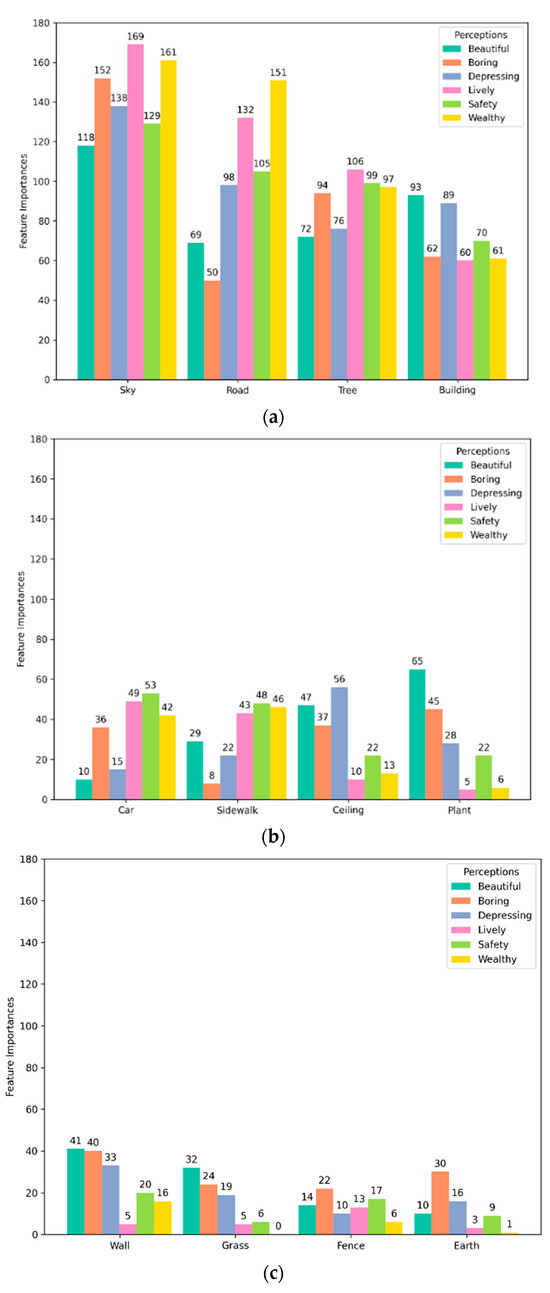 Owing to the Image A’s large tree and sky view indices, Image A had the highest beautiful perceptual score. Despite being in a shopping district, Image B’s wealthy perceptual score was low, likely because the image lacked trees. Image C appeared to be the wealthiest, safest, lively, and boring image because of its extensive collection of urban scene objects. Image D was believed to be the most depressing. This may be because the majority of the images consisted of artificial buildings and were dark in hue.