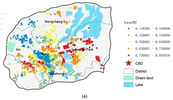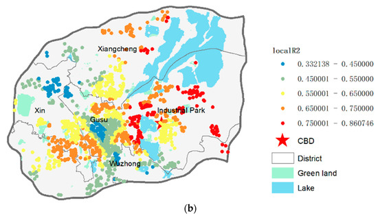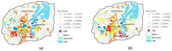 Boring is a negative and unlively perception [9], and a substantial portion of the boring coefficients were negative in Figure 10a, indicating that the boring perception in these communities was inversely proportional to housing prices. However, many communities had positive boring coefficients, such as several communities in the Wuzhong and Xiangcheng districts. This implies that an increase in boring scores may increase the housing price. Safety is a positive perception, and several communities in the Gusu, Xiangcheng, and Wuzhong districts had positive safety coefficients, indicating that safety perception is proportional to housing prices. Meanwhile, the safety coefficients were negative in certain outlying suburbs, indicating that an increasing safety score may decrease housing prices. This may be due to the fact that these areas are in suburbs and life is not convenient.