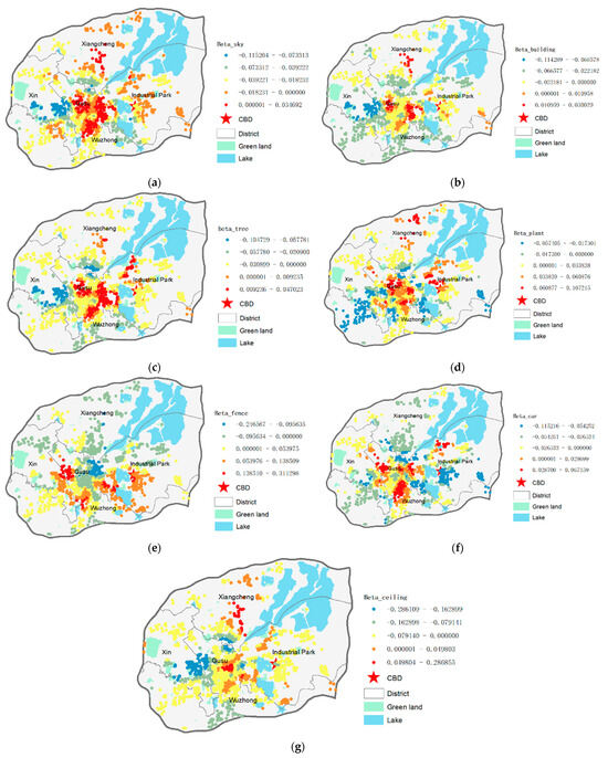 Coefficient estimates for Model 4 (view indices). (a) Sky view index coefficients. (b) Building view index coefficients. (c) Coefficients of the tree view index. (d) Coefficients of the plant view index. (e) Coefficients of fence view index (f) Coefficients of car view index. (g) Coefficients of the ceiling view index.