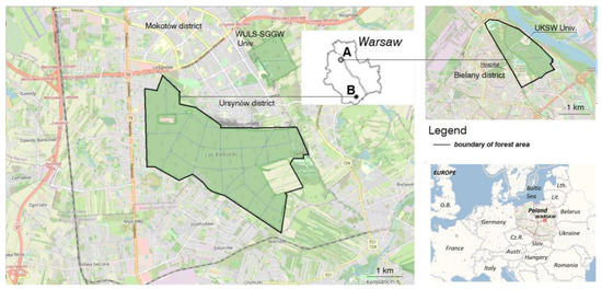 Location of forest areas in Warsaw, Poland: A—the Bielański Forest, B—the Kabacki Forest (author’s elaboration based on: Open Street Maps [75] and Geoportal [76]).