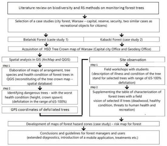 The research framework of the present study is described below. It consists of, first, a literature review on biodiversity and LiDAR regarding tree crown mapping. Secondly, two similar urban forest areas (urban nature reserves) were selected, both of which are important for recreation in Warsaw. Second, spatial analysis was performed in QGIS, using the High Structural Diversity Crown Map of the selected forests, finding areas with the highest index of defoliation (presented in Tables S1 and S2). Based on the collected data, two steps were done, as follows: (1) biodiversity maps for defoliated trees (range 65–100% defoliation), and (2) the maps of the dangerous trees (defoliated trees) were created for both forests. Based on the highlighted locations, the coordinates of the weakest trees in both cases were localized in the database and mapped in QGIS (an Open-Source Geographic Information System). Using these locations, site observations were performed in tow steps, as follows: (1) field workshops with health condition analyzes of the selected trees, in which deadwood, broken branches, humus diseases, leaning trees, and threats to human health and recreation were evaluated, (2) supplementing the tables of defoliated trees of their health characteristic including height and health conditions were done. Based on GIS information and field mapping hazard maps with dangerous trees were created with safety buffer zones around them. Finally, further directions for development and guidelines for local authorities and citizens and the application of this research in the future in similar cases and scientists in the fields of urban ecology, landscape architecture, forestry, dendrology, and RS were presented (Figure 2).