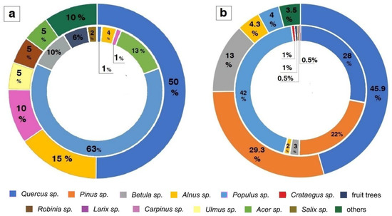 Percentage of defoliated trees (inside ring) on the background of all trees of the forest (outside ring), (a)—the Bielański Forest, (b)—the Kabacki Forest (author’s elaboration based on Database of the High Structural Diversity Tree Crown Map for Warsaw).