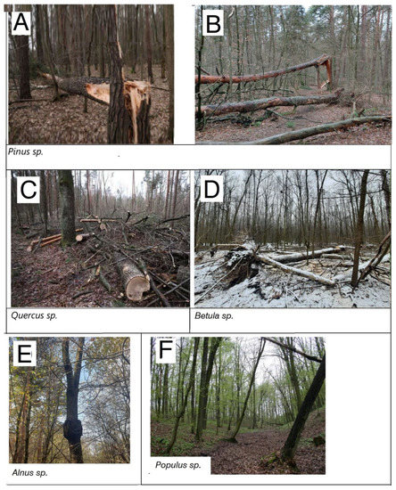Among these 16 characteristics, feature 1 (broken or dry falling branches) was the most noticeable in both forests (Figure 4A,D,E, and Figure 5E). These features were most evident in the following tree species: Acer, Quercus, and Populus. Due to the nature of forests as reserves, no attempt was made to care for them. Features 2–16 were less noticeable, mainly due to sanitary cuts made in connection with difficult recreation in more representative parts of both forests (Figure 4B,C and Figure 5B–F). These features were most evident in the following tree species: Populus, Quercus, Pinus, and Betula. Based on our field observations, it appears that features 1 and 13 (trunk intersection) were especially dangerous. They were inclined adjacent to the forest paths, posing a threat to forest safety and recreation (Figure 4A,D,E and Figure 5B,F). These features were most evident in the following tree species: Acer, Populus, and Quercus.